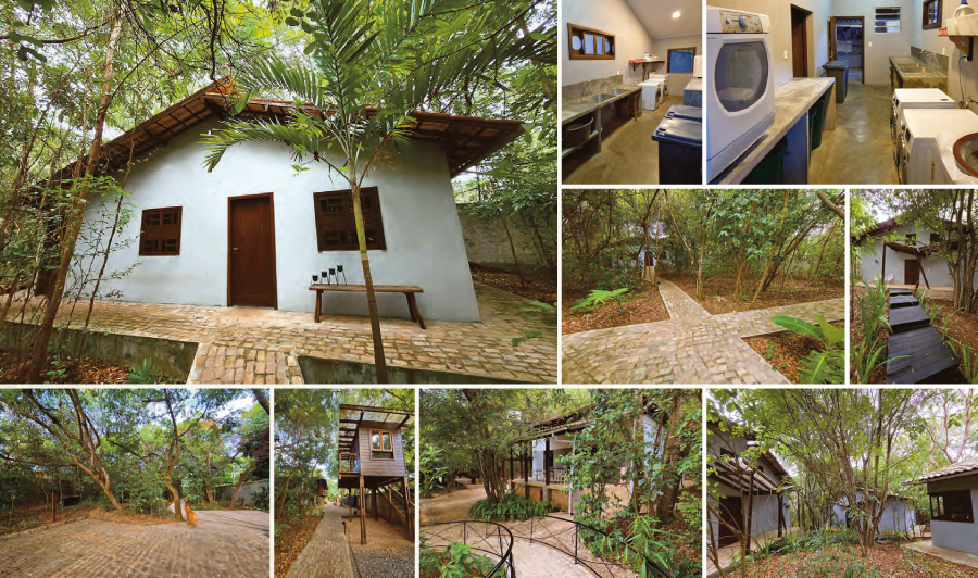 The laundry module in NatureHouse has 117 m2 of covered area, housing a large laundry room, covered and uncovered areas for drying clothes, 1 food storage room with concrete shelves, 1 refrigerator, 1 tool storage room with concrete shelves, 1 extensive open cabinet with concrete shelves, 2 service rooms, and 1 bathroom.